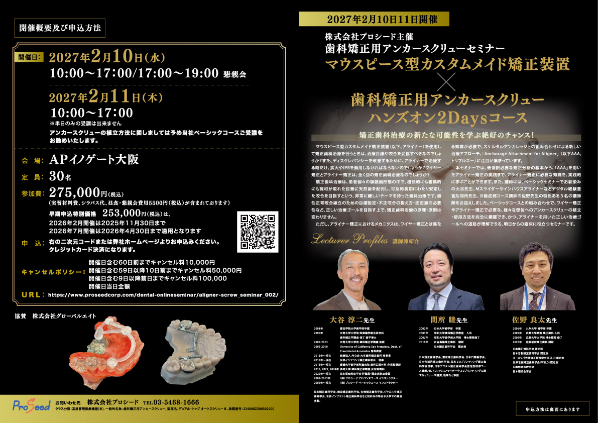 本セミナーでは、最低限必要な矯正分析の基本から、「AAA」を用いたアライナー矯正の実践まで、アライナー矯正に必要な知識を、実践的に学ぶことができます。また、講師には、ベーシックセミナーでお馴染みの大谷先生、Mスライダーやインハウスアライナーなどデジタル経験豊富な間所先生、III級症例コース講師の佐野先生の特色ある3名の講師陣をお迎えしました。ベーシックコースとの組み合わせで、ワイヤー矯正やアライナー矯正で必要な、様々な部位へのアンカースクリューの植立・使用方法を完全に網羅でき、かつ、アライナーを用いた正しい治療ゴールへの道筋が理解できる、明日からの臨床に役立つセミナーです。